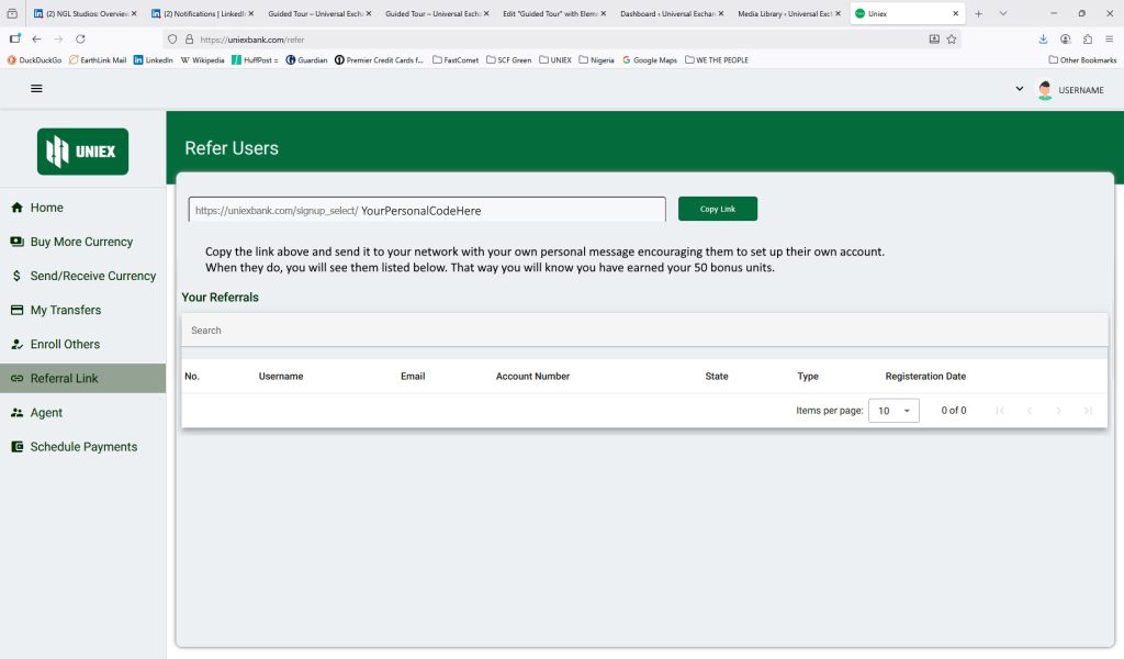 The next option is one in which the person or organization you are recruiting will fill in the signup sheet themselves and they just need to receive a link to the bank signup page, shown immediately above. This is accomplished via the menu option labeled “Referral Link,” as shown in the following screen shot. Note the instructions on that page that instructs you to “Copy the link above and send it to your network with your own personal message encouraging them to set up their own account. When they do, you will see them listed below. That way you will know you have earned your bonus units.” That referral link contains a unique code associated with your UNIEX account, so when the person or organization follows that link to sign up, the bank will know that you are the one that referred the new user. If you have a personal social network of contacts, this is a great way to earn a bunch of units just by sending them that link and encouraging them to sign up.
