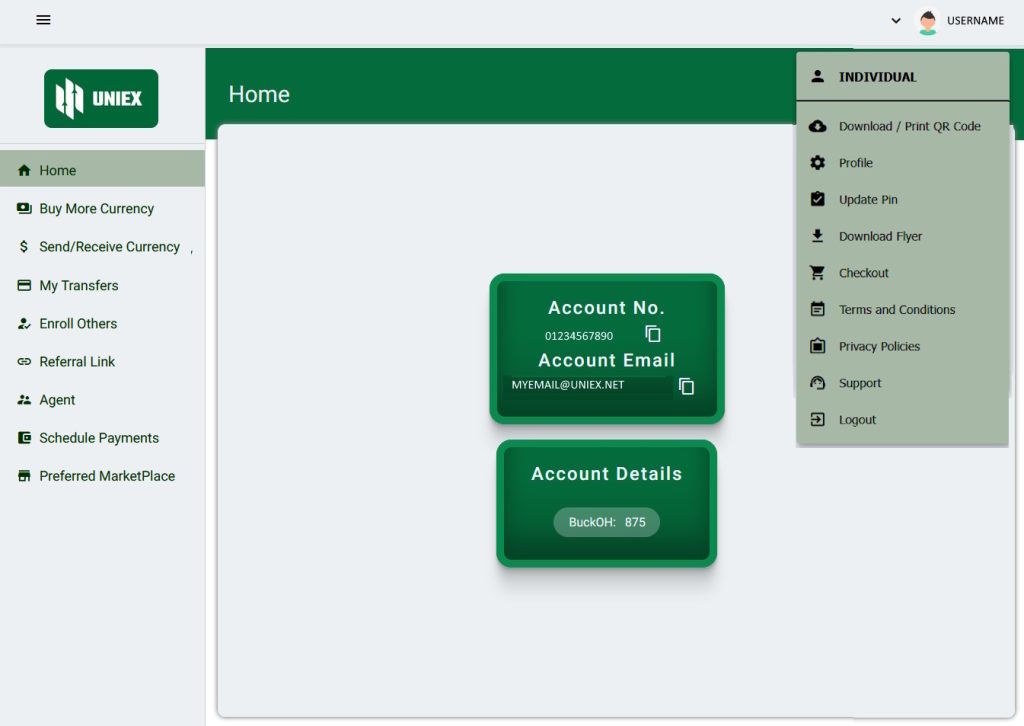 Next – notice that you have two options on the left hand menu for getting other people to enroll in the system and thereby earn a bonus of your currency for each person or organization that joins UNIEX. (The amount of the bonus depends on your account type.) The first option entails you doing the enrollment for them, by clicking on the menu option on the left labeled “Enroll Others.” As introduced above, there are 5 different account types on UNIEX. You then select the account type the fits the party you are enrolling and fill in the blanks just like you did when you enrolled.