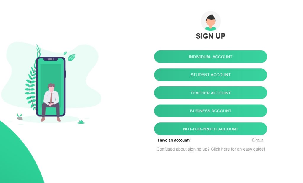From that SignUp page you will select the type of account you will be creating on the bank. There are five different kinds of accounts, each with different features and benefits to those account types. They are Individuals, College Students, Teachers, Non-Profits (NGOs), and Business accounts. The majority of accounts will be for Individuals and here is what that signup page looks like.