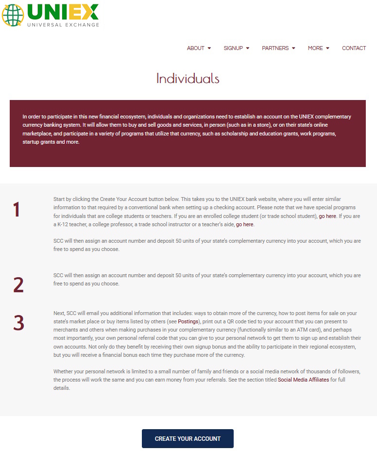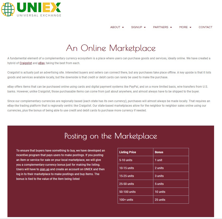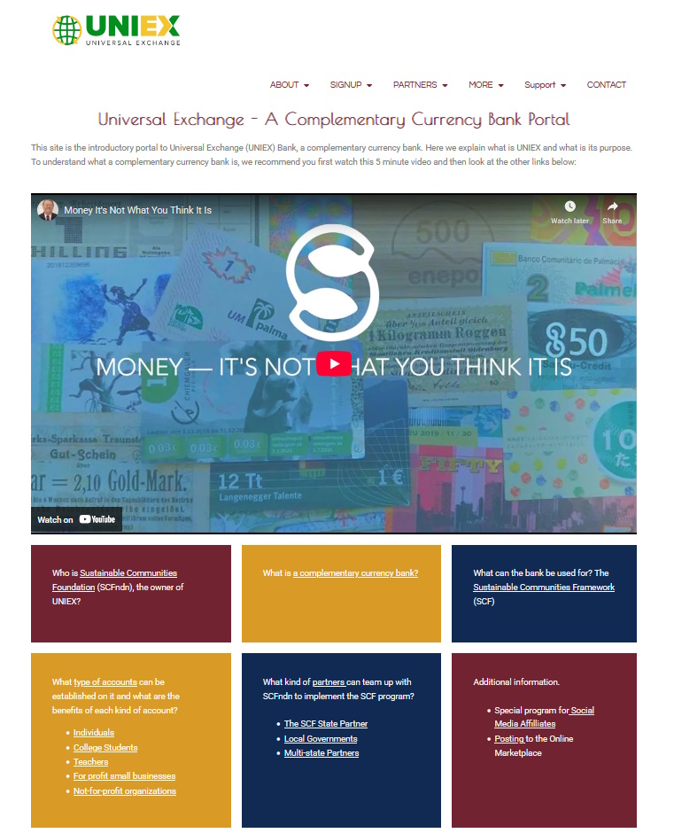 The below pictures will take you on a guided tour of the various elements of the Universal Exchange US (UNIEX) complementary currency banking system and its corresponding marketplace. We start with the home page for this portal website which introduces the complementary currency banking concept. This site provides the means to create an account on the bank, which is shown further down.