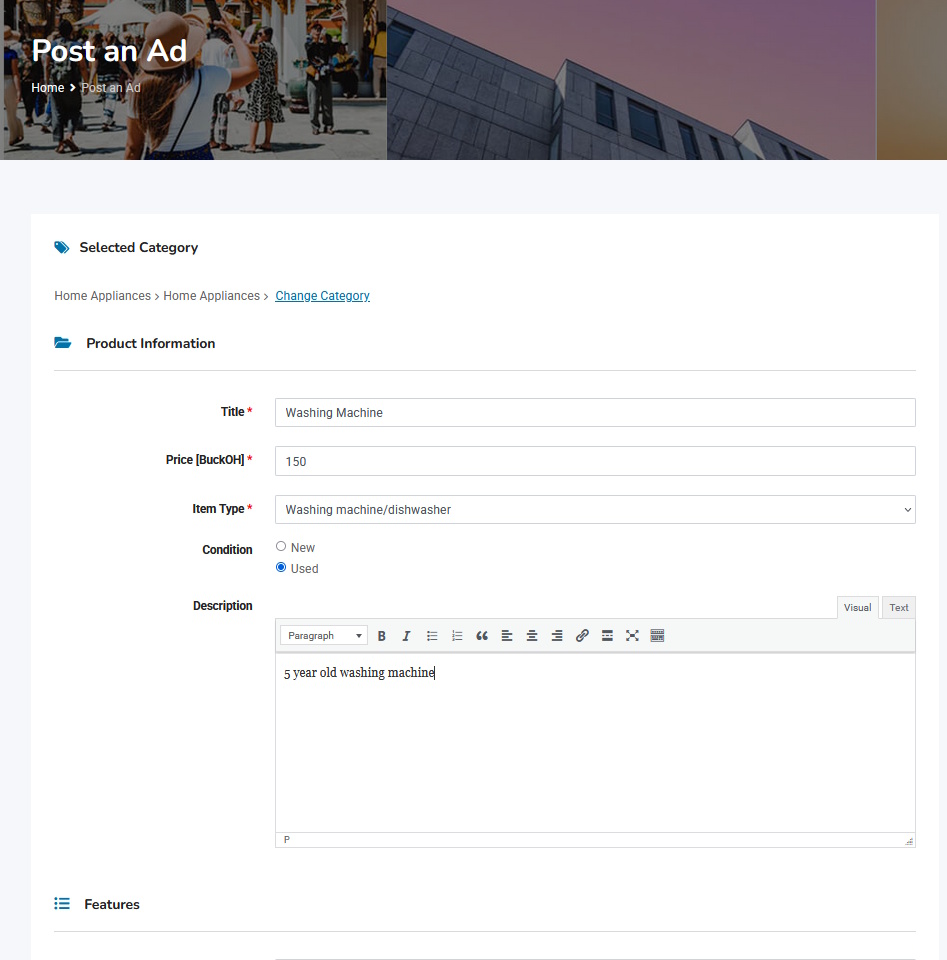 Finally, once you login to your local marketplace, you can sell something or offer your services by selecting the Post Your Ad button in the upper right corner and see the following screen where you can post it.
