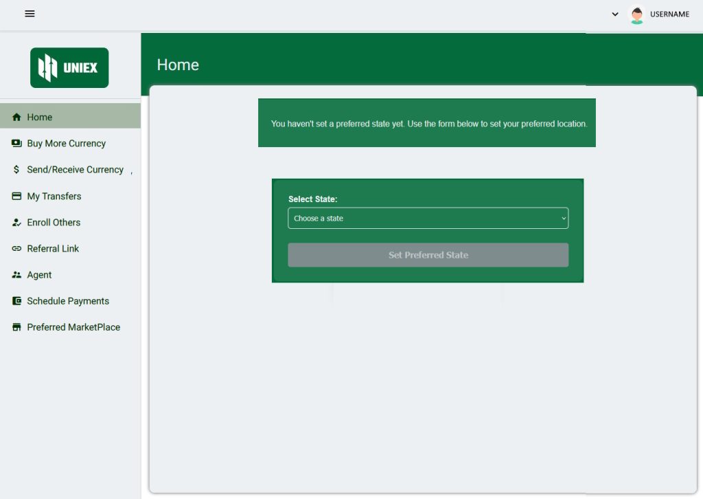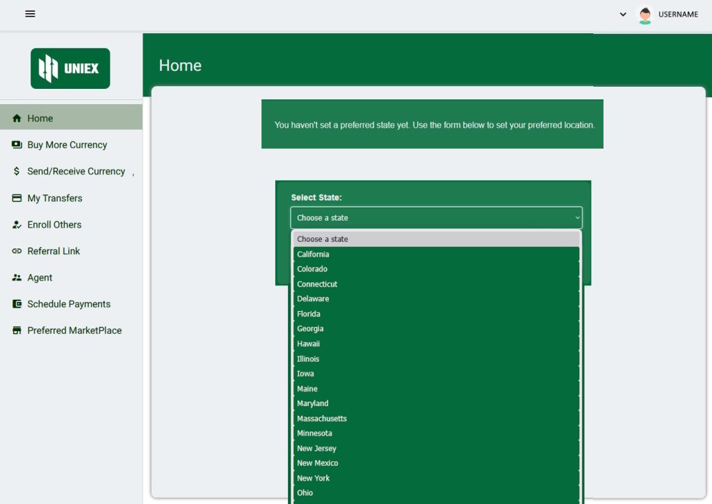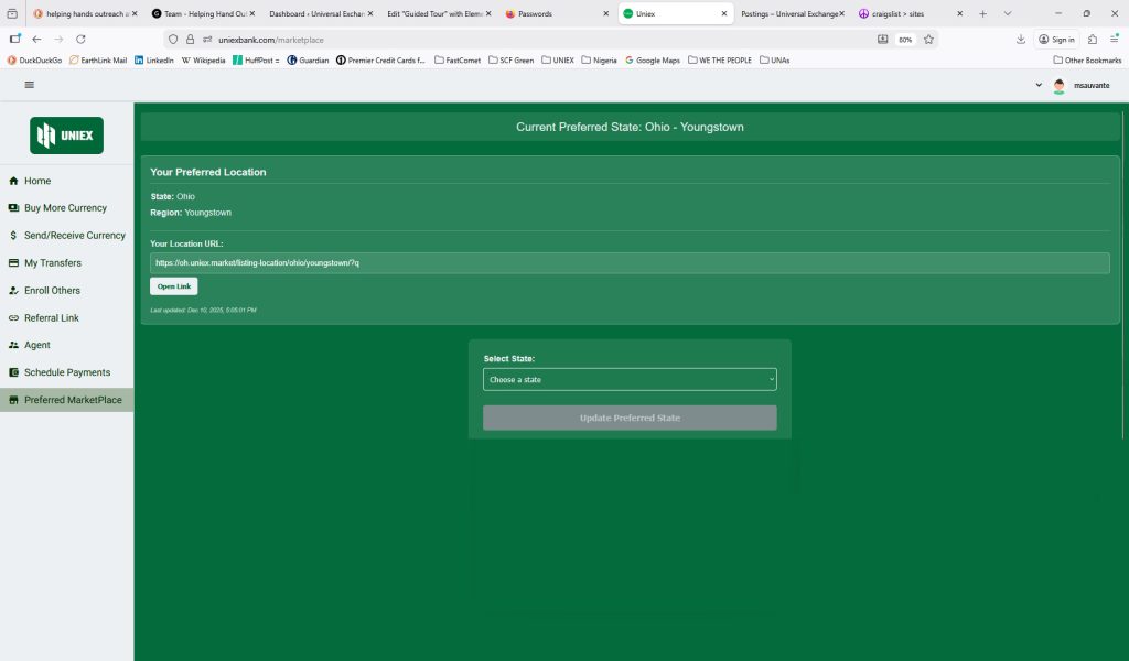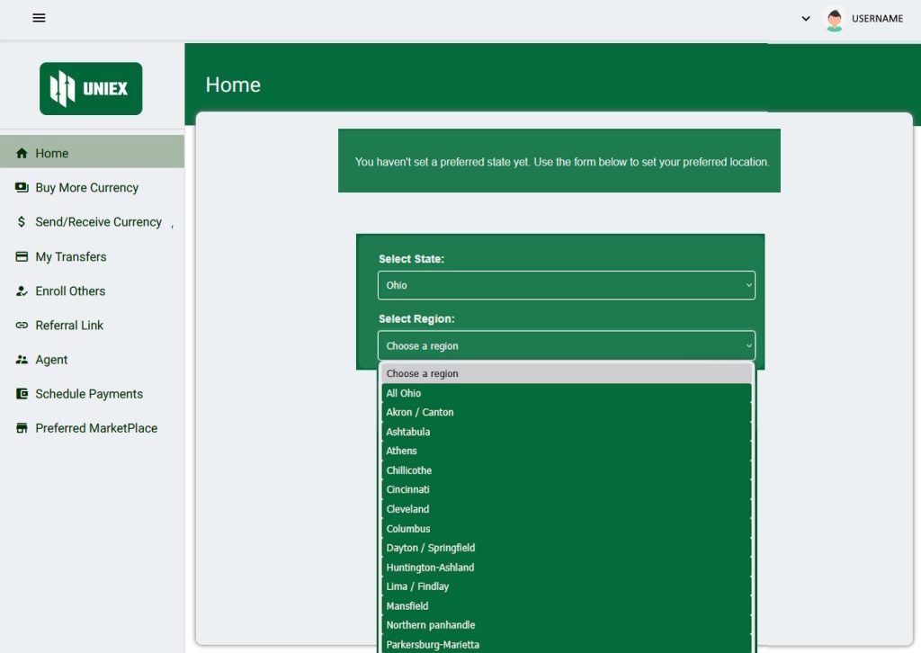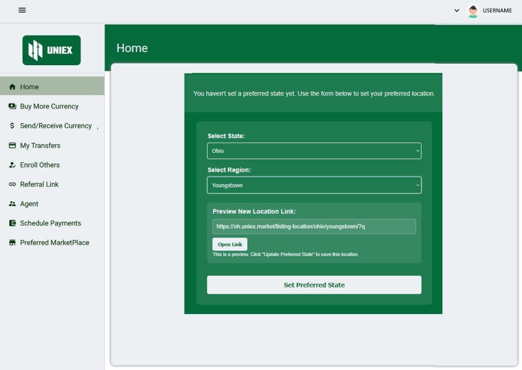 Most of our users will normally shop on their local marketplace, even though they can shop on any site throughout the entire United States. As a result, we have added a feature to your UNIEX checking account page that lets you select your default marketplace. You setup that up for the first time by selecting the left menu option labeled Preferred MarketPlace, as seen on the screen below.