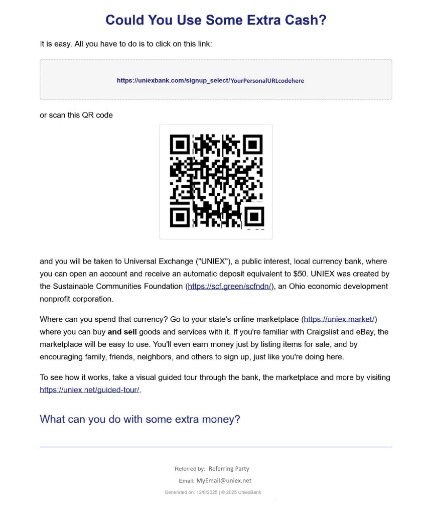Here is an example of that flyer that you can hand out to prospective new account holders, or you can copy the contents of that flyer into an email message to send to others. That flyer contains your enrollment custom URL from the previous option as well as a custom QR code which yields that same custom URL if the user scans it into their phone or other device capable of reading QR codes.